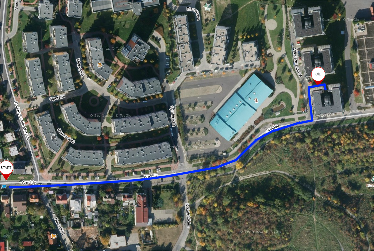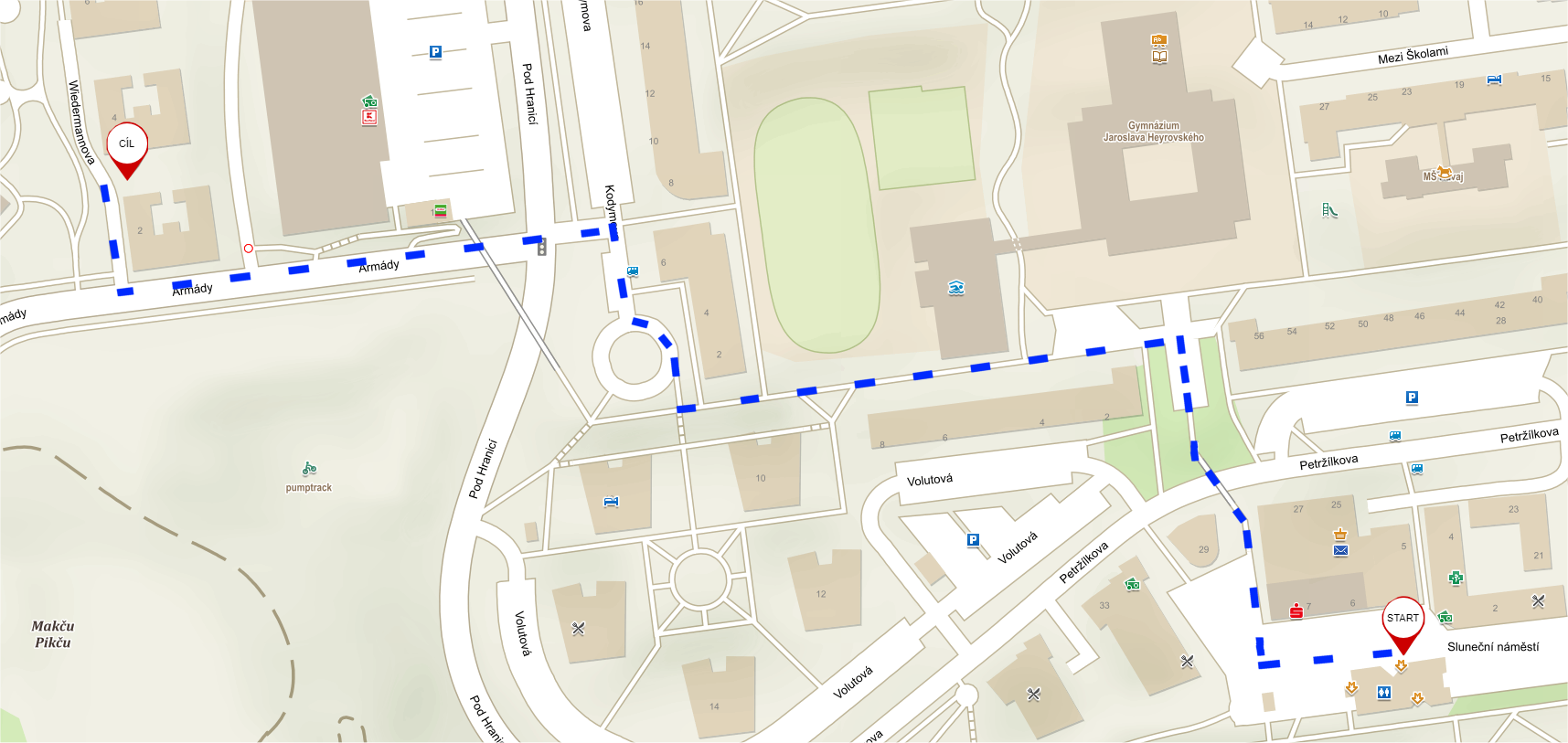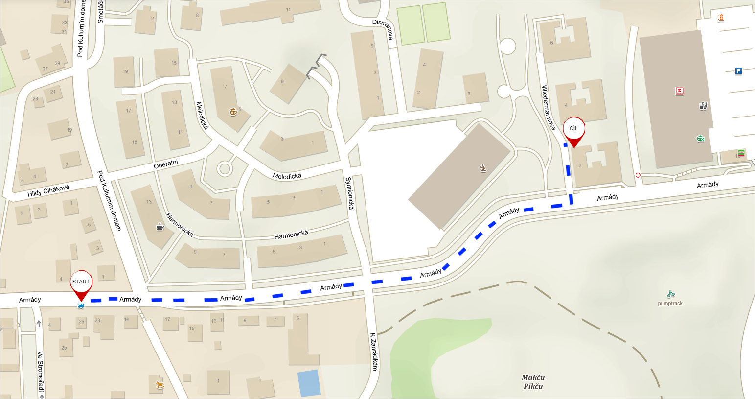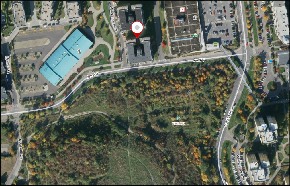 MHD: Pokud Vám nevadí kratší procházka, doporučujeme využít linky metra „B“, v rámci které pojedete na zastávku „Hůrka“. Odtud je to rychlou chůzí cca 6 minut, pomalou chůzí cca 10 minut (mapka přesné trasy je zde a zde a zde nebo zde a zde a zde). Můžete taktéž využít autobusové linky, nejblíže je zastávka „Kodymova“ (doba chůze 4 minuty; mapka přesné trasy je zde a zde a zde), dále můžete jet na zastávku „Nová Kolonie“ (doba chůze 6 minut; mapka přesné trasy je zde a zde a zde) a nebo na zastávku „Bucharova“ (doba chůze 9 minut; mapka přesné trasy je zde a zde a zde).